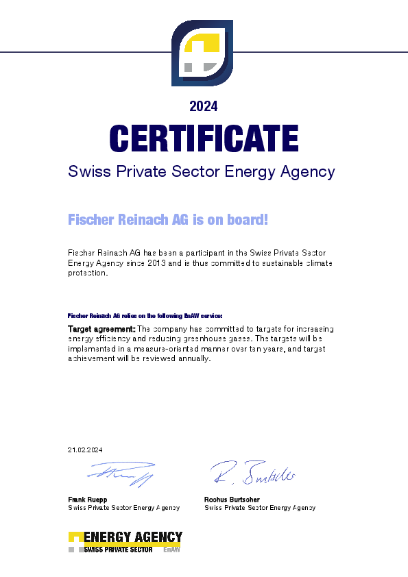 Fischer Reinach AG has been a member of the Energy Agency for Industry (EnAW) since 2013 and is therefore committed to clearly defined targets for increasing energy efficiency and reducing greenhouse gas emissions.